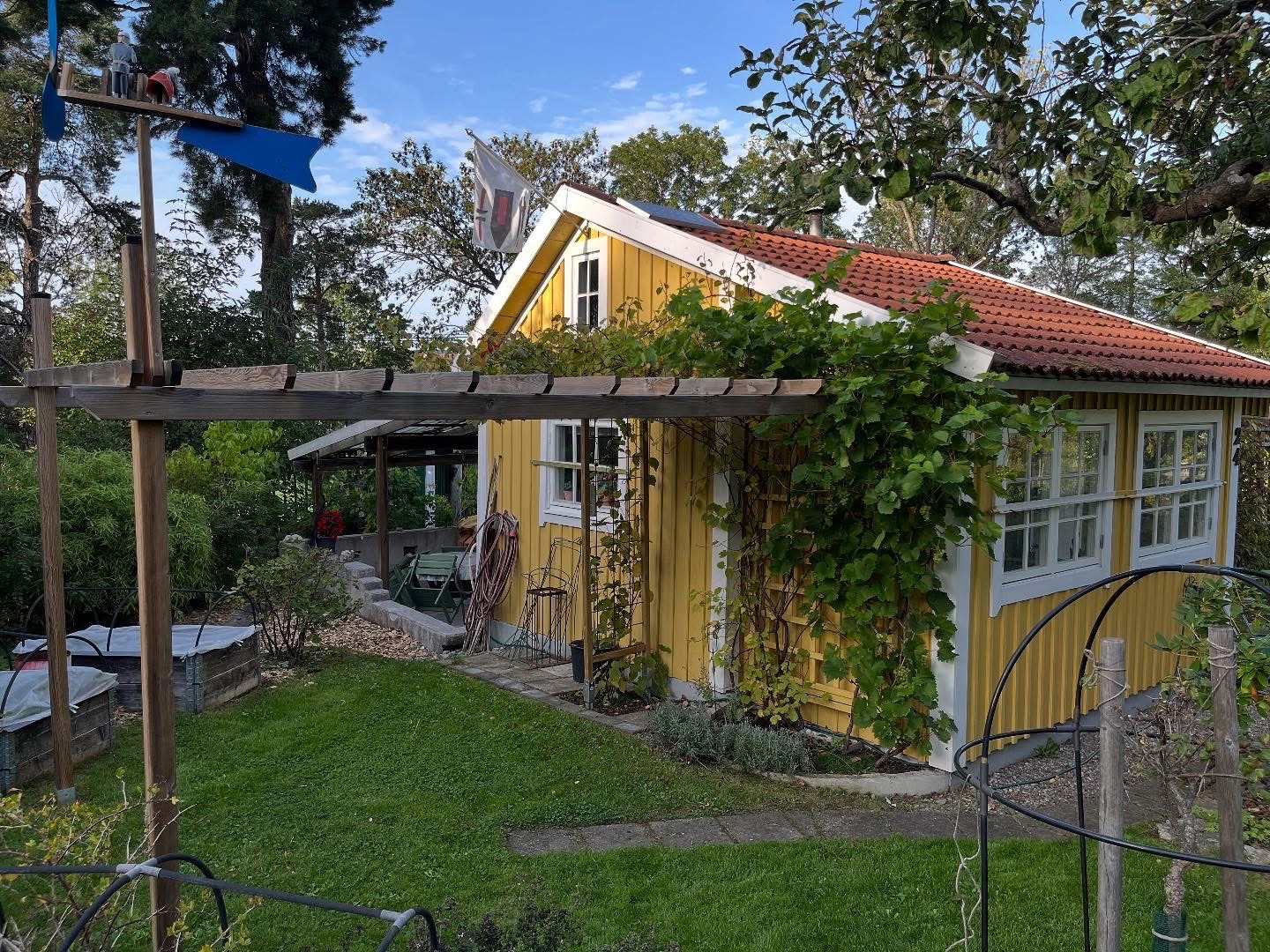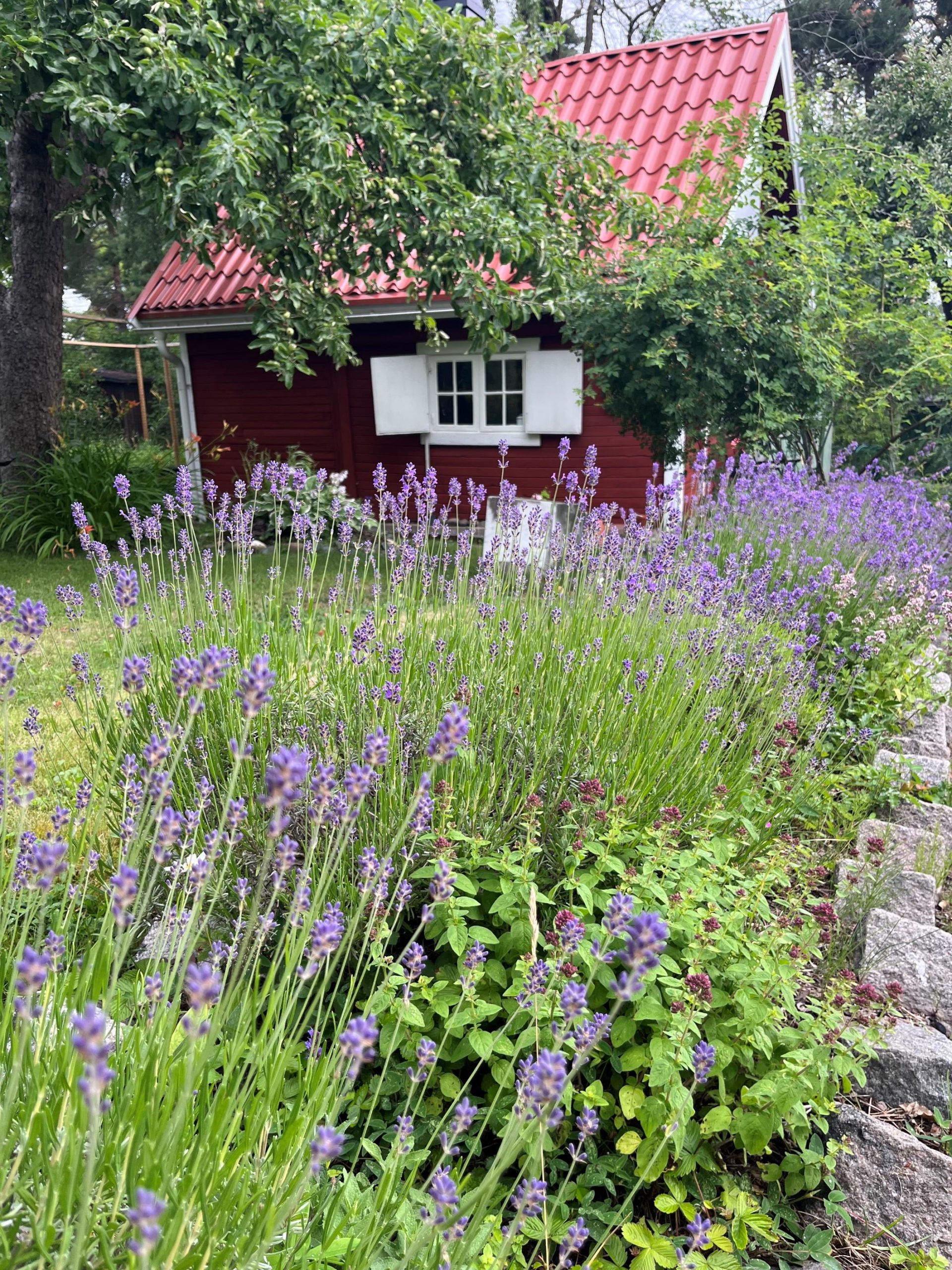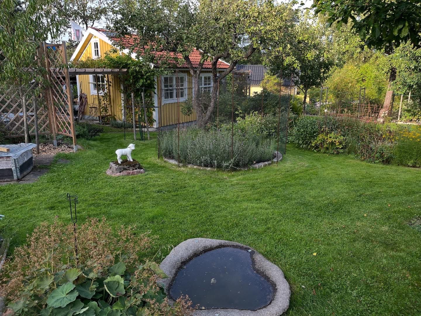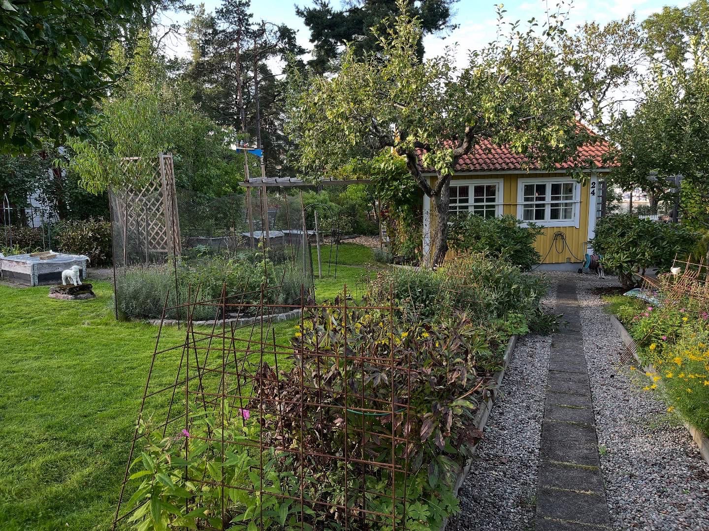 En av de största trädgårdarna i området med flera gamla fruktträd – äpple, päron och plommon – samt bärbuskar, en lavendelrabatt och mycket annat. I den stora odlingslådan vid ena sidan av huset odlas potatis, rabarber, kål och andra grönsaker. Följ Stuga23 på Instagram.